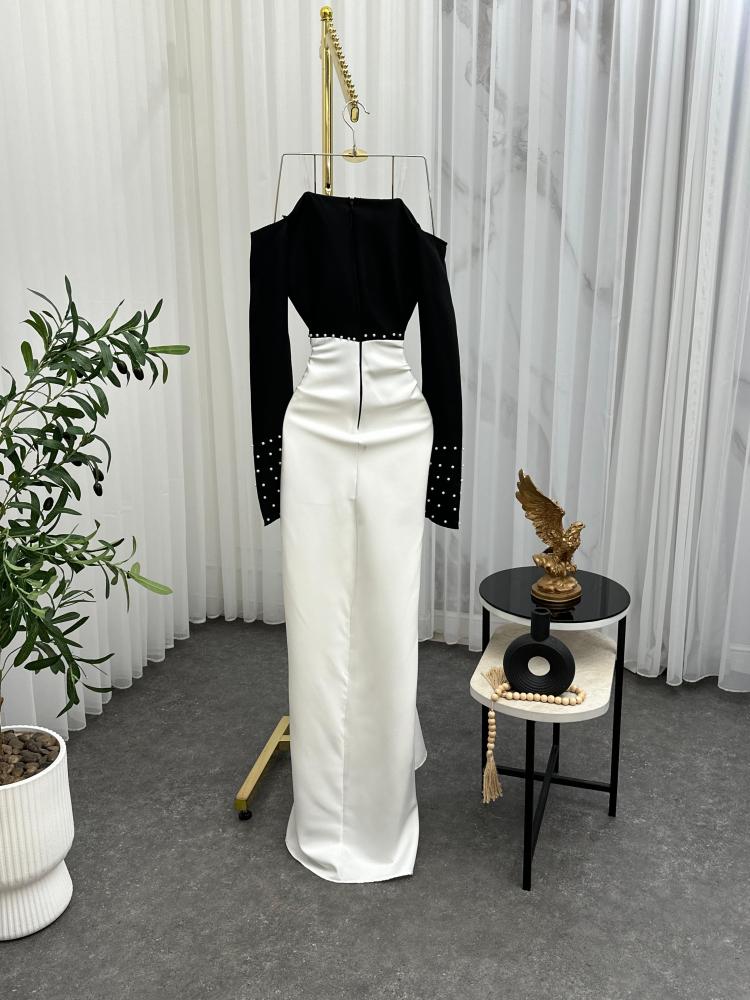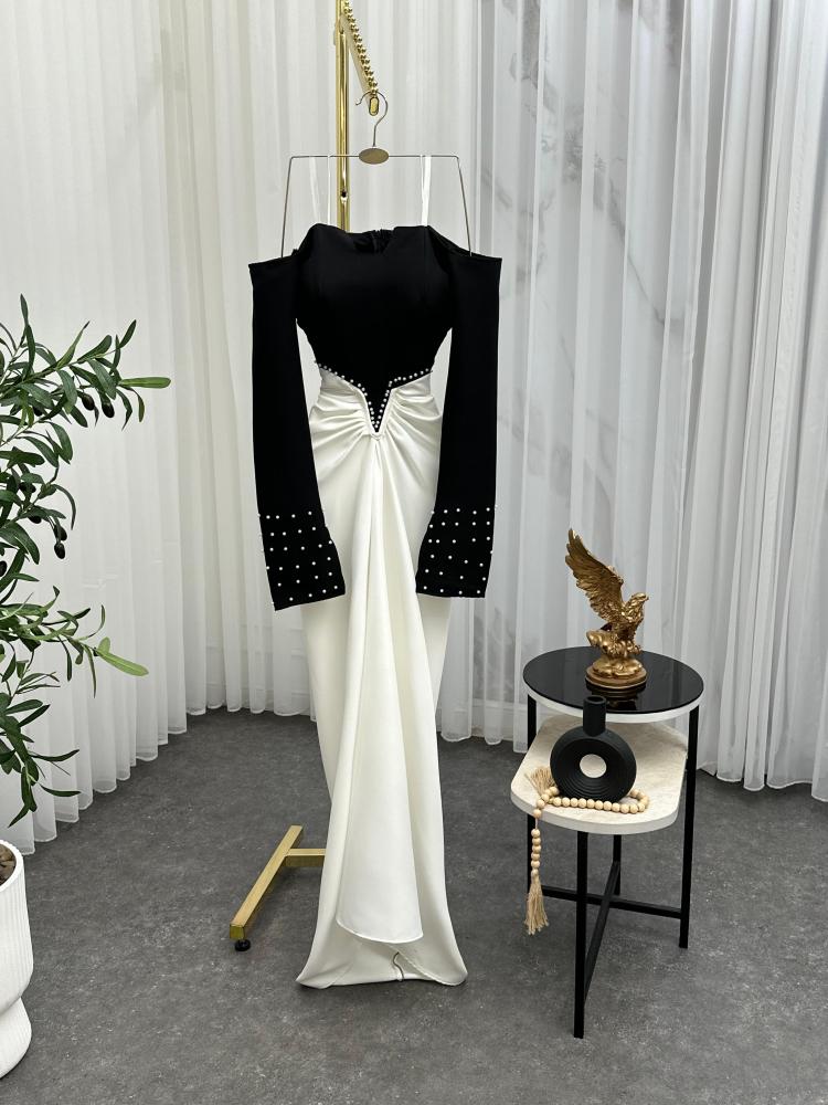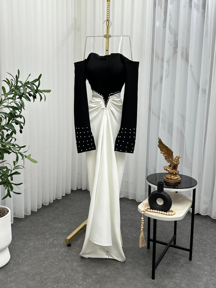 فستان سهرة أسود وأوف وايت بتصميم أوف شولدر جذاب، أسود محدد بالخياطة والخرز الفاخر، وتنورة ناعمة منسدلة بتكسيرات أنثوية. الأكمام الطويلة مرصعة بحبات لؤلؤ أنيقة تضيف لمسة ملكية للفستان. مثالي لحفلات الزواج أو مناسبات العيد