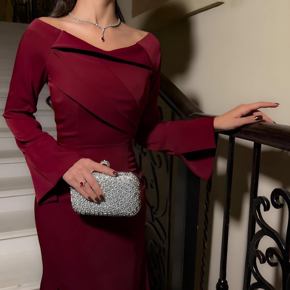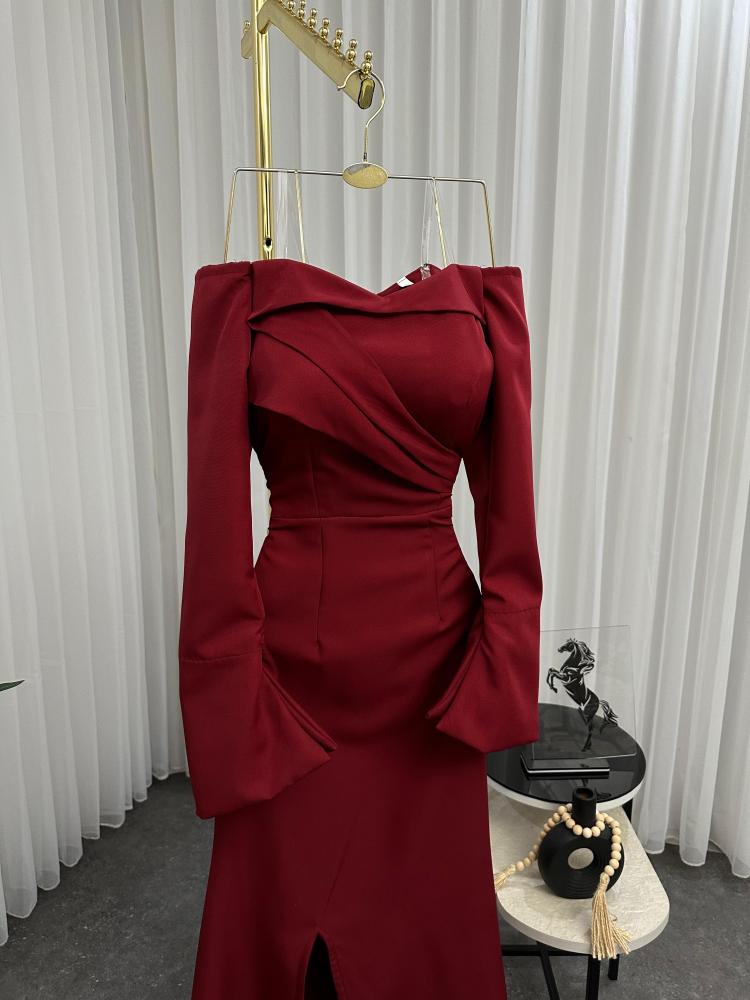 فستان سهرة ناعم احمر برغندي بذيل لإطلالة ناعمة وخلابة