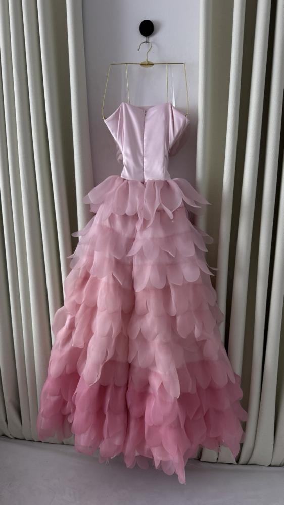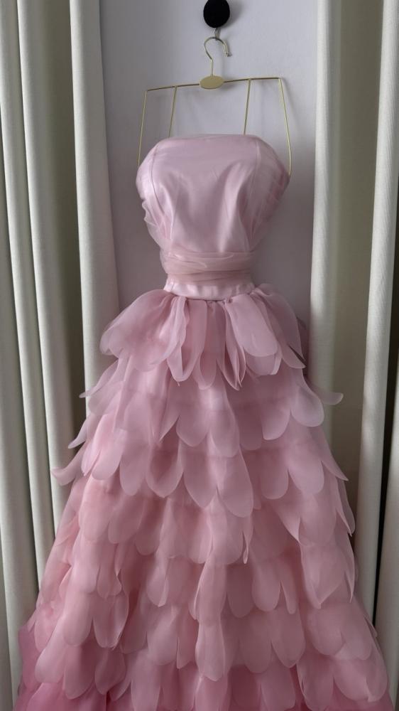 فستان سواريه باللون الوردي بتصميم منفوش، يتميز بتفاصيل طبقات أوراق متدرجة تمنح إطلالة مليئة بالأنوثة والجاذبية.